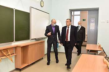 Глава Марий Эл Александр Евстифеев оценил ремонт фасада здания, затем осмотрел кабинет начальных классов и малый актовый зал.