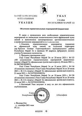 Указом Главы Республики Марий Эл Александра Евстифеева №152 от 10 сентября 2021 года в связи с проведением всех необходимых ограничительных мероприятий по ликвидации эпизоотического очага африканской чумы свиней и выполнением запланированных противоэпизоотических и профилактических мероприятий отменены ограничительные мероприятия — (карантин) по африканской чуме свиней на отдельной территории дер. Красное Селище Горномарийского муниципального района в границах 69 квартала Дубравного лесного участка Руткинского лесничества.