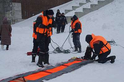 Перед практической отработкой была проведена профилактическая беседа по безопасному поведению на водоемах в зимний период. Были продемонстрированы различные способы спасения людей, провалившихся под лед - самоспасение, спасение с помощью различных подручных средств спасения (веревки, куска доски и т.д.)