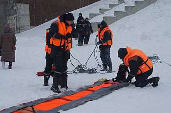 В рамках Месячника безопасности на водных объектах в зимний период 15 декабря 2021 года в городе Йошкар-Ола на р. Малая Кокшага, в районе Патриаршей площади прошли показные занятия по спасению людей, провалившихся под лед различными способами.