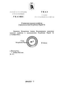 Указом Главы Республики Марий Эл Ю.В.Зайцева №200 от 07.11.2022 г. Кондратенко Андрей Владимирович назначен министром сельского хозяйства и продовольствия Республики Марий Эл с 7 ноября 2022 г.