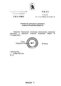 Указом Главы Республики Марий Эл Ю.В.Зайцева №201 от 07.11.2022 г. Герасименко Александр Анатольевич назначен министром транспорта и дорожного хозяйства Республики Марий Эл с 7 ноября 2022 г.