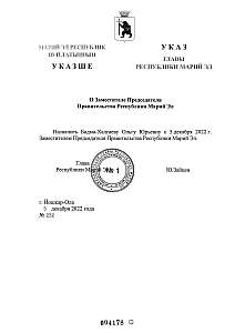 Указом Главы Республики Марий Эл №232 от 05.12.2022 г. Ольга Юрьевна Бадма-Халгаева с 5 декабря 2022 г. назначена Заместителем Председателя Правительства Республики Марий Эл.