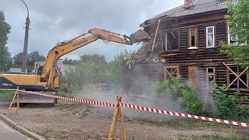 Сегодня в Волжске (Марий Эл) на улице Мира разбирают расселенный деревянный дом. Рабочие в спецодежде, по надписям на которой можно догадываться о подрядчике, вооружившись инструментом и защитными касками прямо с утра принялись за активный снос двухэтажного барака.