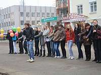 Затем состоялся флеш-моб в честь 90-летнего юбилея Республики. Все школы построились в буквы и дружно выкладывали слово «Марий Эл». Мы общими усилиями справились с задачей, а затем громко и весело кричали поздравления в адрес республики. Ребята оформили свои поздравления на ярких листах бумаги, привязали их к воздушным шарам, которые на счет «1, 2, 3» взлетели в осеннее небо.