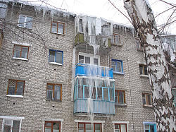 Сбиваем их регулярно, только растут они, как грибы. С чего бы это? На дворе морозы, больших температурных перепадов еще не было, а снег на кровле тает. Хотя состояние ее далеко не аварийное, жильцы верхних этажей мучаются не первый год – потолки и стены мокрые. И все потому, что чердака нет, покрытие плоское, теплоизоляция неправильная. Сами посмотрите, какие ледяные глыбы нарастают над головами прохожих!
