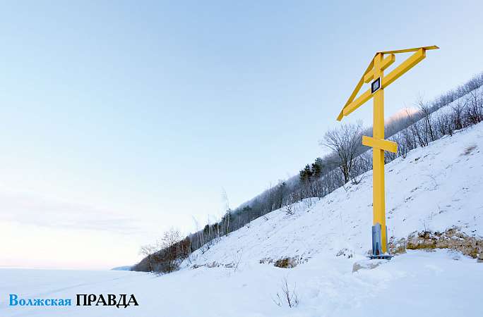 Массивный семиметровый крест установлен на противоположном от Волжска крутом берегу Волги