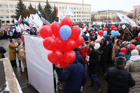 Сегодня сотни жителей Республики Марий Эл вновь вышли на митинг в честь воссоединения Крыма и Севастополя с Россией. В мероприятии принял участие и Глава региона Леонид Маркелов.