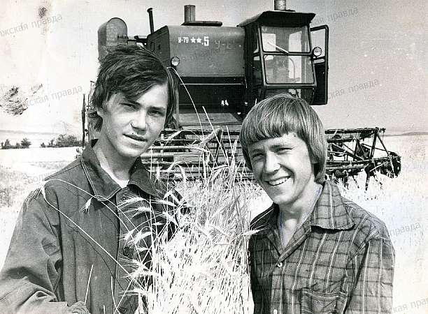 Волжские хлеборобы. Ретрофотография из архива "ВП". На снимке датированном концом 70-х - началом 80-x г.г. комбайнеры колхоза "Москва" (Волжский район) Евгений Данилов и Иван Комаров.