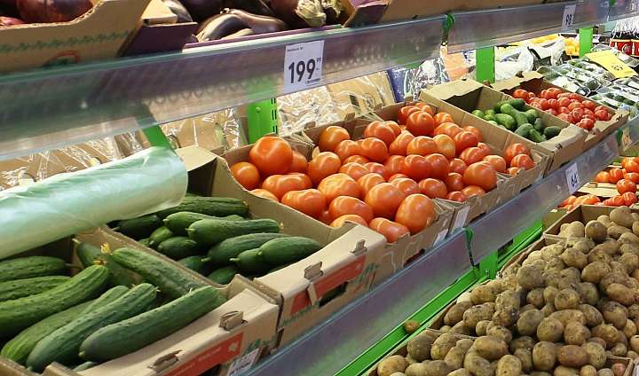На общее удешевление продуктов питания (на 1,2%) основное влияние оказало снижение цен на плодоовощную продукцию (на 11,1%). Наиболее значительно снизились цены на свёклу столовую, морковь на 41,3%, картофель – на 27,0%, виноград – 20,2%, свежие помидоры – на 18,9%, бананы – на 18,8%, огурцы – на 15,4%, капусту белокочанную свежую – на 14,4%. Вместе с тем, лимоны подорожали на 21,1%, апельсины – на 5,9%.