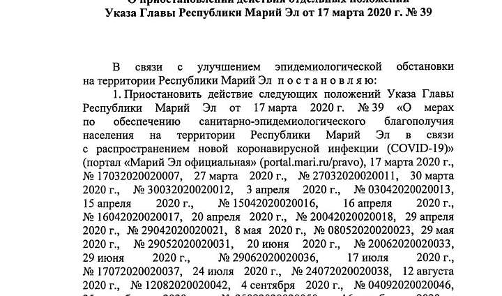 В Марий Эл приостанавливается действие отдельных положений Указа №39