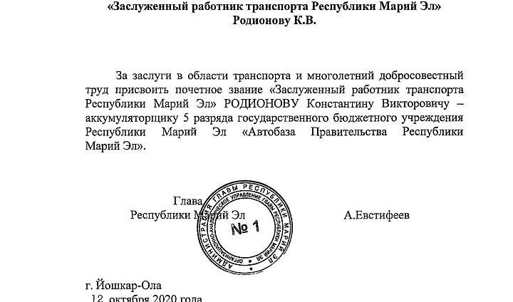 Указом Главы Республики Марий Эл Александра Евстифеева №195 от 12 октября 2020 года за заслуги в области транспорта и многолетний добросовестный труд присвоено почетное звание «Заслуженный работник транспорта Республики Марий Эл» РОДИОНОВУ Константину Викторовичу — аккумуляторщику 5 разряда государственного бюджетного учреждения Республики Марий Эл «Автобаза Правительства Республики Марий Эл».