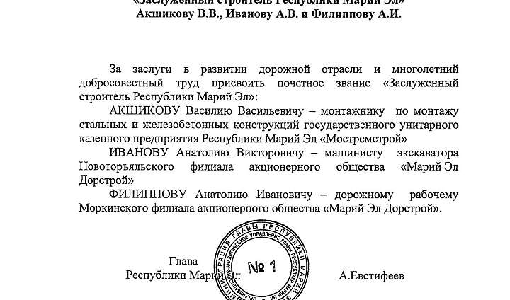 Троим работникам дорожной отрасли присвоено почетное звание «Заслуженный строитель Республики Марий Эл»
