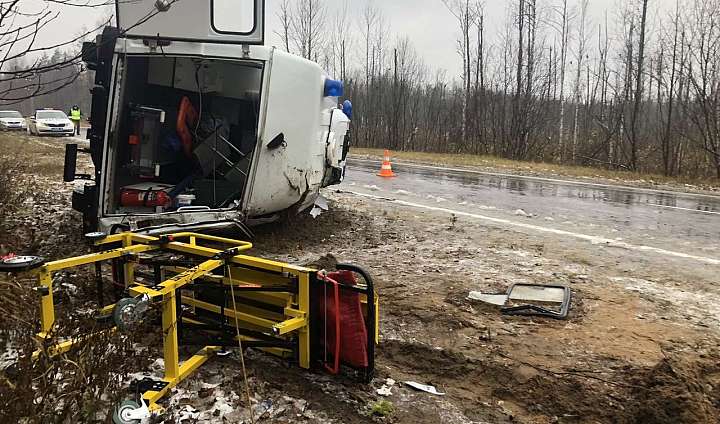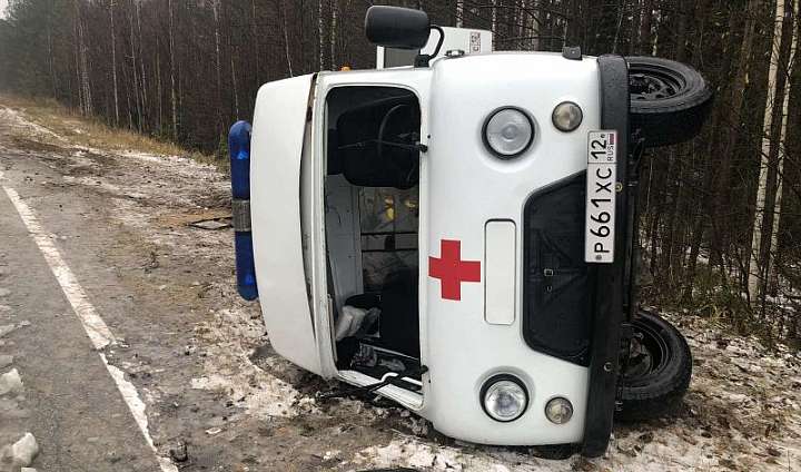 На 97 км автодороги «Йошкар-Ола-Козьмодемьянск» 32-летний водитель автомашины скорой медицинской помощи, предварительно, не выбрал безопасную скорость движения, не справился с управлением и совершил опрокидывание на правую сторону. В результате ДТП травмы получили двое медицинских работников.