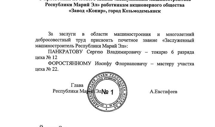 Указом Главы Республики Марий Эл Александра Евстифеева №114 от 21 июля 2021 года за заслуги в области машиностроения и многолетний добросовестный труд присвоено почетное звание «Заслуженный машиностроитель Республики Марий Эл» (работникам акционерного общества «Завод «Копир», город Козьмодемьянск):