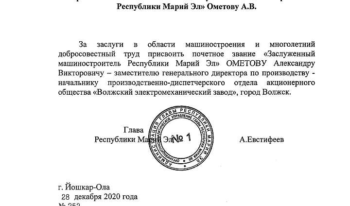 Указ Главы Республики Марий Эл Александра Евстифеева №252 от 28 декабря 2020 года за заслуги в области машиностроения и многолетний добросовестный труд присвоено почетное звание «Заслуженный машиностроитель Республики Марий Эл» ОМЕТОВУ Александру Викторовичу — заместителю генерального директора по производству - начальнику производственно-диспетчерского отдела акционерного общества «Волжский электромеханический завод», город Волжск.